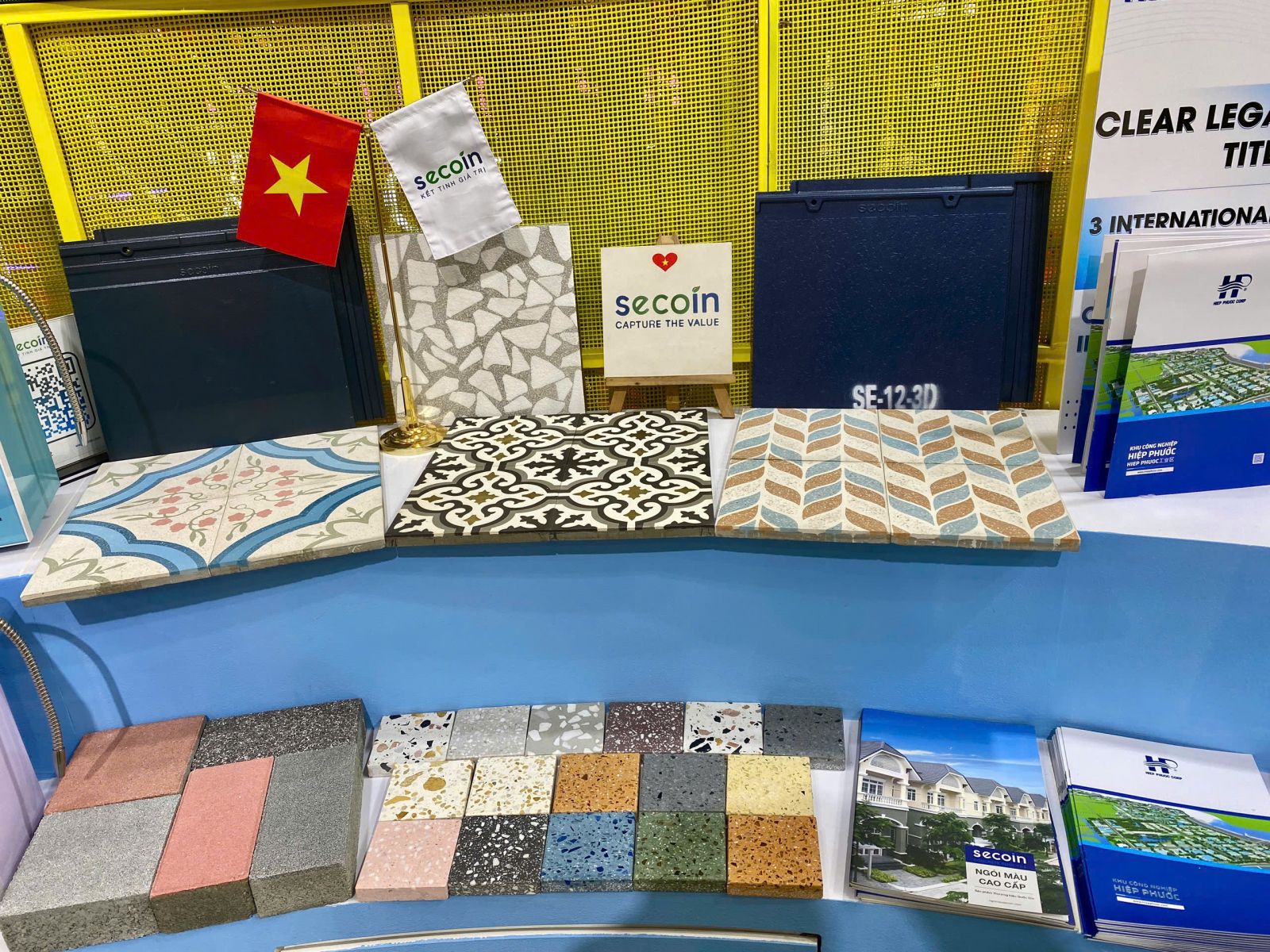 Tại khu trưng bày của Secoin, khách tham quan được trực tiếp trải nghiệm hệ sinh thái sản phẩm đa dạng như: gạch terrazzo, gạch nghệ thuật, vật liệu trang trí nội – ngoại thất với thiết kế tinh tế, màu sắc phong phú và giá trị thẩm mỹ cao. Các bộ sưu tập được sắp đặt hài hòa, kết hợp giữa truyền thống và hiện đại, phản ánh rõ nét triết lý phát triển của Secoin: “Capture the Value – Kết tinh giá trị”.