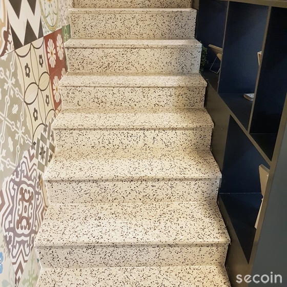 Bậc cầu thang Terrazzo Secoin được làm từ chất liệu tấm Terrazzo một lớp cao cấp và ép trên dây chuyền thiết bị hiện đại giúp cho sản phẩm có khả năng chịu lực và chịu va đập. Bên cạnh nhiều mẫu thiết kế đẹp mắt phối hợp hài hòa giữa màu nền và màu hạt đá trang trí, bậc cầu thang Terrazzo Secoin có thể được làm theo thiết kế của khách hàng.