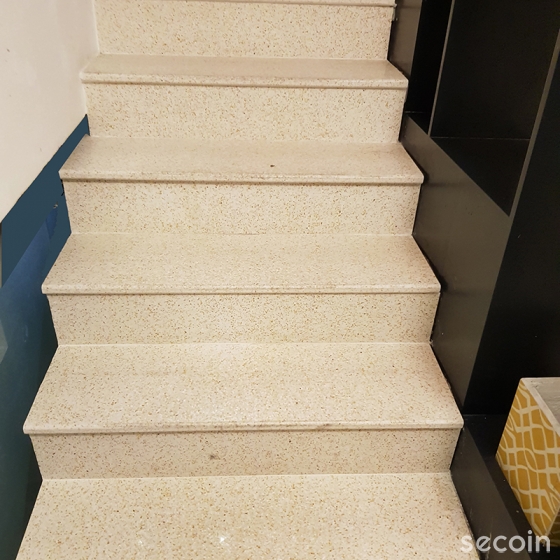 Bậc cầu thang Terrazzo Secoin được làm từ chất liệu tấm Terrazzo một lớp cao cấp và ép trên dây chuyền thiết bị hiện đại giúp cho sản phẩm có khả năng chịu lực và chịu va đập. Bên cạnh nhiều mẫu thiết kế đẹp mắt phối hợp hài hòa giữa màu nền và màu hạt đá trang trí, bậc cầu thang Terrazzo Secoin có thể được làm theo thiết kế của khách hàng.