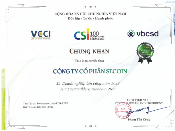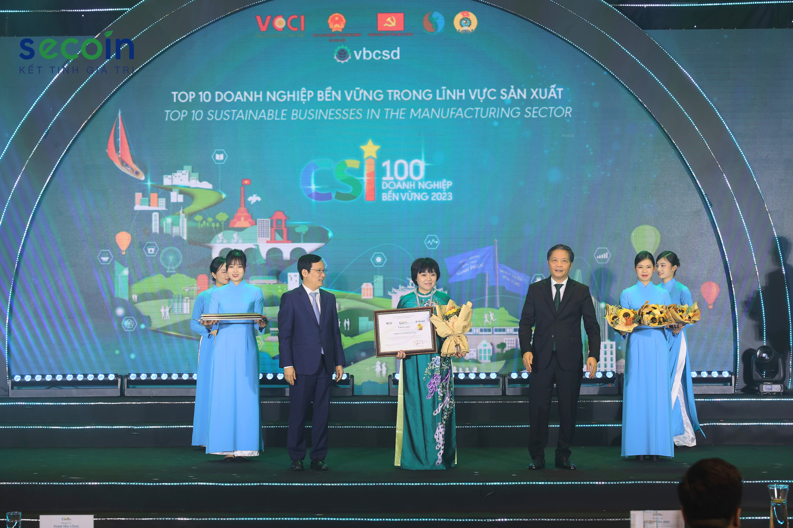 Secoin liên tiếp được công nhận Doanh nghiệp phát triển bền vững (2022-2023). Secoin cũng là doanh nghiệp duy nhất trong ngành xây dựng, vật liệu xây dựng và bất động sản được vinh danh tại Top 10 Doanh nghiệp bền vững trong lĩnh vực sản xuất năm 2023, sánh cùng các tên tuổi lớn và uy tín như Nestle Vietnam, Heineken, Coca-Cola, Vinamilk.