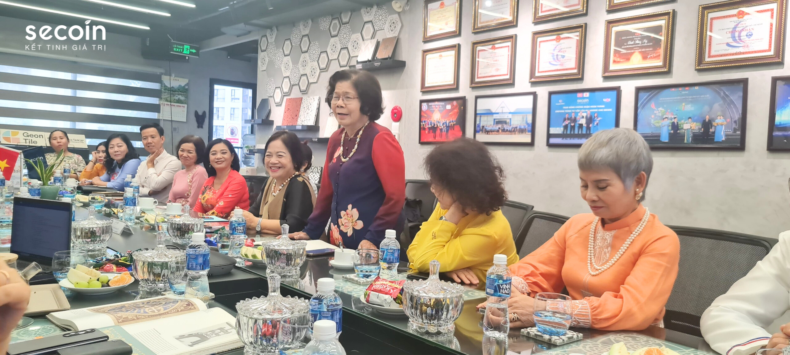 On the afternoon of March 7, 2024, the delegation of the program "Ho Chi Minh City, Heritage - Connection", led by Ms. Nguyen Thi Thanh Tam - President of Vietnam Ao Dai Heritage Club, member of the Board of Directors Manager of the Fund for Supporting the Preservation of Vietnamese Cultural Heritage visited and discussed at the Secoin office and showroom in Ho Chi Minh City. The visiting delegates were surprised when entering the display space of colorful and patterned encaustic tiles and heard the story of the ups and downs of Vietnamese encaustic tiles over many generations. In particular, the discussion had the participation and comments from Journalist Vu Kim Hanh on how to preserve and develop Vietnamese heritage products.